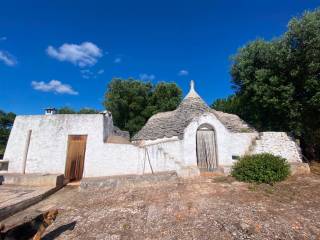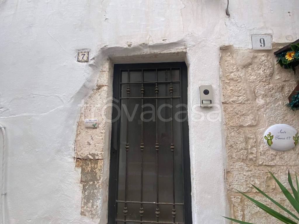 Al piano terra abbiamo l'ingresso indipendente direttamente da vico Martiri d'Otranto e subito la scala che porta al primo piano, qui entriamo in una grande sala divisa in due ambienti con volte a stella, nel primo c'è un comodo divano letto ed è stato inoltre realizzato un soppalco in legno dove troviamo il primo letto matrimoniale; sempre al primo piano, nel secondo ambiente con finestra che affaccia sul vico, abbiamo un angolo cottura il tavolo da pranzo e l'accesso al bagno con doccia; da qui parte la scala che porta al piano superiore, a metà scala abbiamo un piccolo vano di circa 2 mq con altezza 1 metro utilizzato come deposito molto comodo per stivare le valige o gli oggetti di uso non quotidiano, salendo ancora si arriva al primo piano dove troviamo una camera da letto con letto in muratura a due piazze e l'accesso al primo dei due terrazzi, qui sono stati realizzati una doccia esterna con acqua calda e fredda, un lavatoio ed un mobiletto che ospita la lavatrice; salendo la scala si arriva sul solaio di copertura della stanza da letto anch'esso calpestatile dal quale si gode di una bellissima vista su ostuni che spazia fino al mare.