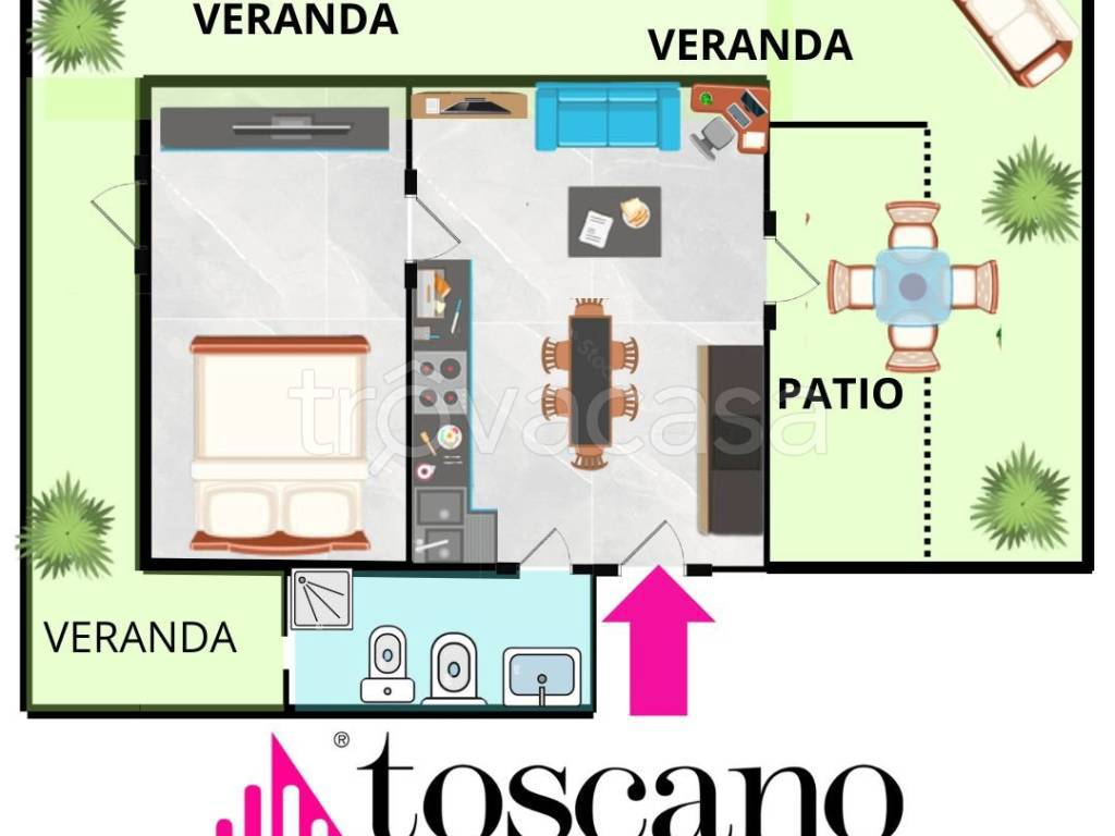 - Superficie Interna: Circa 40 mq, con una divisione interna funzionale che comprende un angolo cottura in open space sul soggiorno e una luminosa camera matrimoniale.