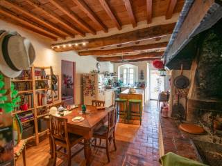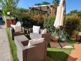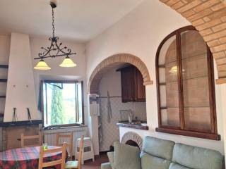 L'appartamento: Al piano terra: ingresso, bagno, sala da pranzo, ampio soggiorno/salone con camino in marmo francese, cucina abitabile in muratura collegata alla loggia coperta sulla terrazza. Completa il piano un ulteriore ambiente con angolo cottura, caminetto e saletta (utilizzabile anche come sesta camera), collegato con una scala al piano superiore.