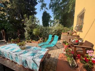 Al piano terreno si apre un elegante e ampio soggiorno, seguito da una luminosa sala da pranzo con accesso diretto a una spaziosa terrazza in cotto e pietra, ideale per pranzi e cene all’aperto. La cucina in muratura, realizzata nello stile tipico dell’arte povera e arricchita da pregiate maioliche blu, trasmette carattere e calore. Completano il livello un bagno di servizio e un pratico ripostiglio.