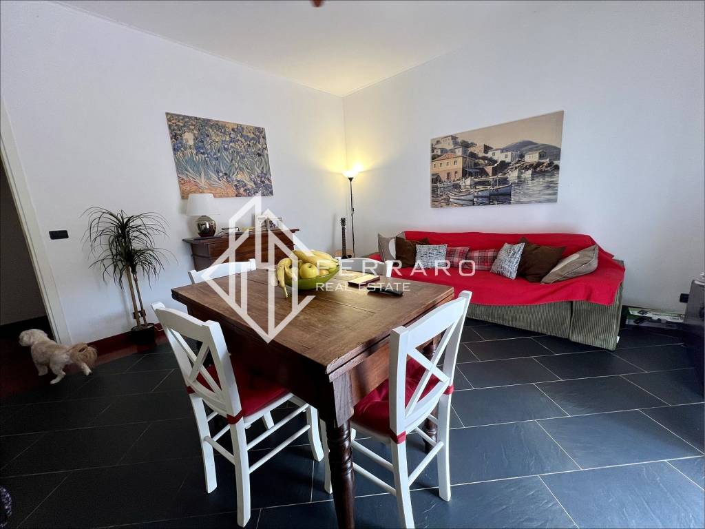 L'immobile si apre su una zona giorno luminosa, dalla quale si accede direttamente a un ampio terrazzo vivibile, perfetto per pranzi all’aperto, momenti di relax o per godere delle miti giornate liguri. La cucina si integra con la zona soggiorno in uno spazio funzionale e accogliente.