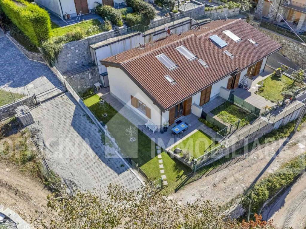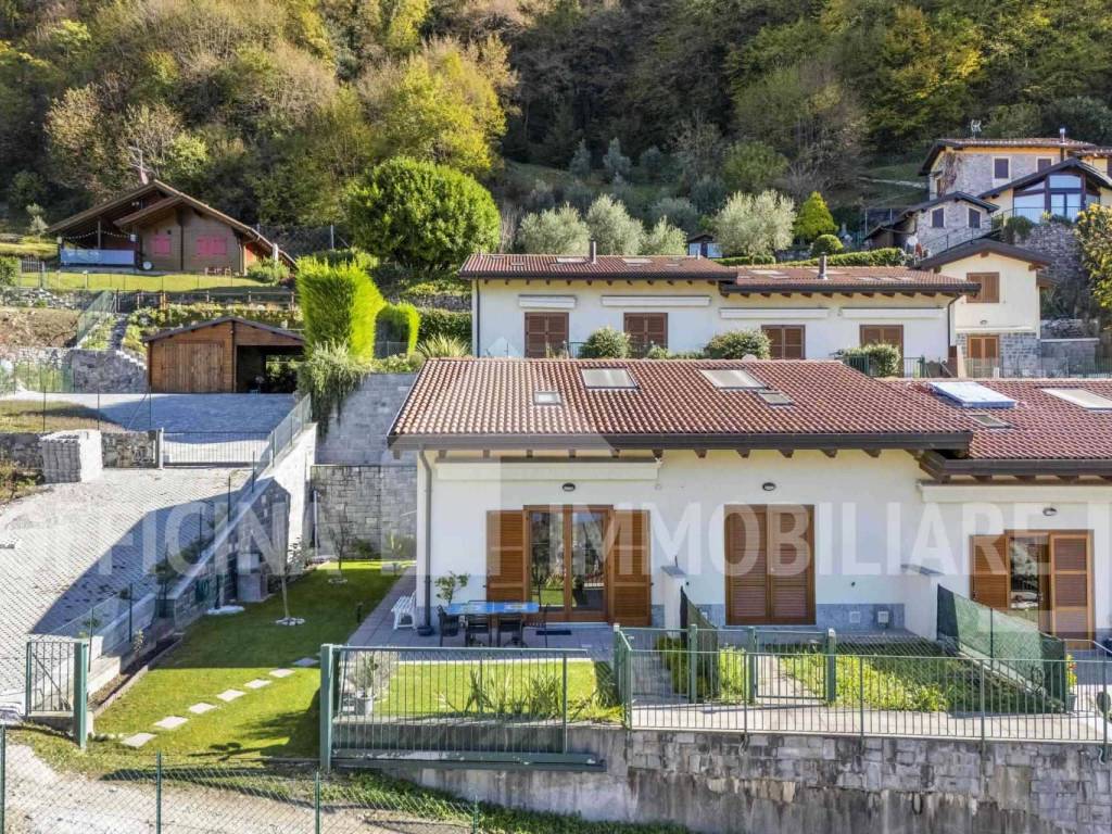 Officina Immobiliare propone in vendita in posizione tranquilla e panoramica, a pochi minuti d'auto dal pittoresco borgo di Varenna, in località Perledo, una raffinata villetta a schiera libera su tre lati, immersa nella quiete e circondata dal verde, con una vista lago mozzafiato che accompagna ogni momento della giornata.
