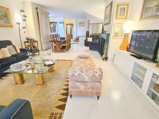 Una veranda fa da ingresso al piano rialzato, di circa 170 mq, che si compone di un'ampia zona living a vista con soggiorno, zona pranzo e camino, seguiti da una spaziosa cucina abitabile e tre camere da letto. A servizio dell'abitazione vi sono due bagni finestrati e un comodo ripostiglio.