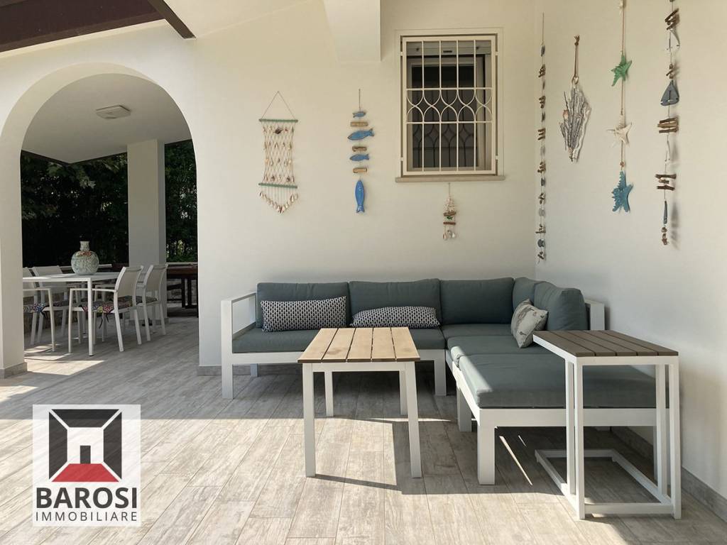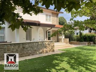 La villa è stata oggetto di una recente e integrale ristrutturazione; è rialzata di qualche gradino dal piano stradale, e ha pregevoli inserti in pietra naturale e un’estetica classica delle ville degli anni ‘70, che è stata valorizzata dai recenti interventi. L'ingresso alla proprietà avviene attraverso cancello pedonale e cancello carrabile automatico, e all'interno del giardino è possibile parcheggiare fino a tre auto. Lo spazio esterno offre un giardino ben curato; una terrazza scoperta e due portici coperti offrono l'opportunità sia di pranzare e cenare all'aperto che di godere della vista rilassante del giardino. La zona esterna si completa sul retro della casa dove sono situati una zona con doccia calda, lavandino e barbecue in muratura, due ripostigli e un locale tecnico per la caldaia.