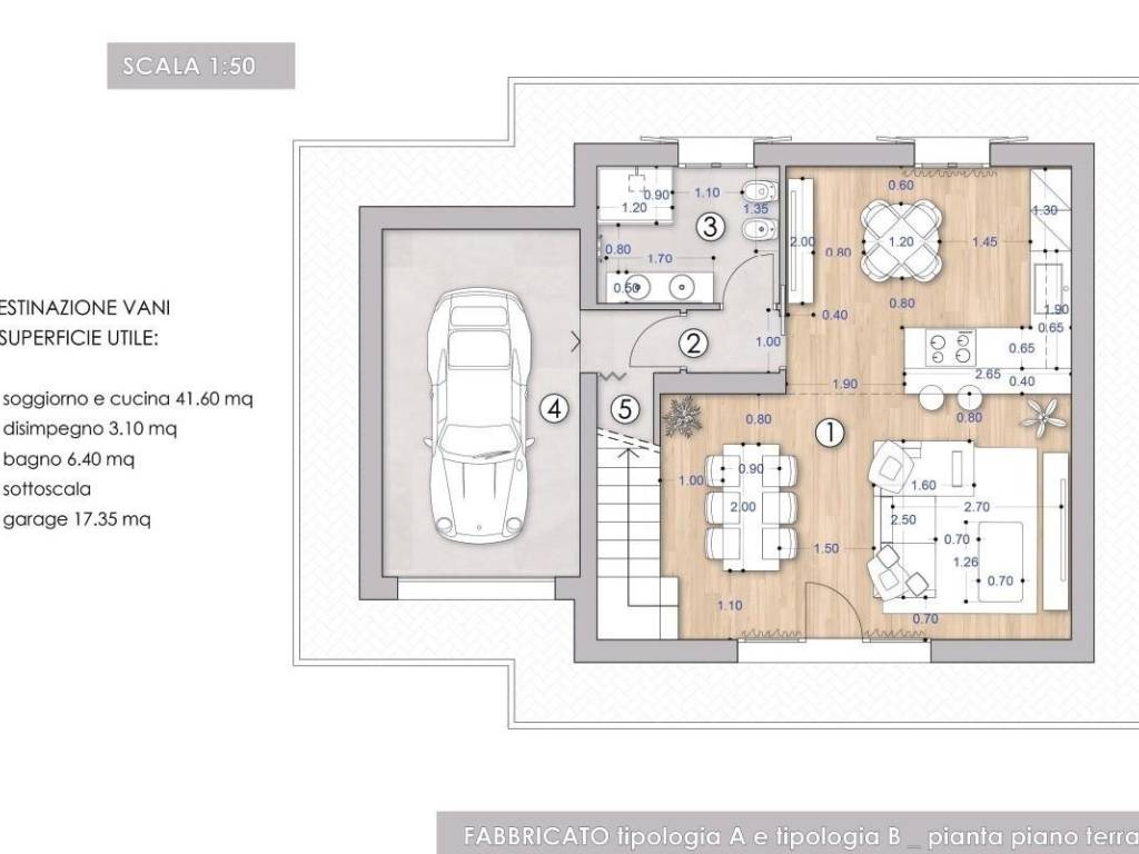 La proprietà, in fase di ultimazione, si articola su due piani per una superficie totale di 140 mq e presenta la seguente suddivisione degli spazi: