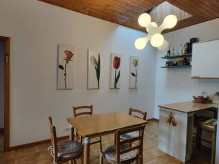 Al piano terra rialzato: zona giorno composta da ingresso, studio, bagno finestrato con doccia (rifatto 4 anni fa), cucinotto e sala da pranzo con impianti e pavimenti rifatti recentemente, camino di valore funzionante e accesso a portico e ampio giardino, grande soggiorno con parquet e accesso a balcone coperto.
