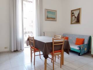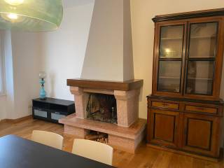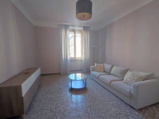 Luminoso soggiorno con camino, cucina abitabile, camera matrimoniale, camera singola, bagno padronale finestrato, bagno di servizio finestrato con latrice e asciugatrice, due balconi con affaccio interno e su via Plinio.