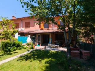 Questa villetta del 1992 nasce con un’anima calda: mattoni faccia a vista, balconi coperti, ambienti luminosi e spazi distribuiti in modo armonico su più livelli. Entrando si sente subito il carattere degli anni ’90 ben costruiti: legno massello, dettagli autentici e un soggiorno che invita a fermarsi, grazie anche al camino perfettamente funzionante, mantenuto negli anni con cura.