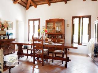 L'immobile è caratterizzato da una doppia entrata: una pedonale da sotto i caratteristici portici Atestini e la seconda, carraia, che conduce al giardino interno e al garage in corpo staccato. L'abitazione vanta un elegante ingresso nel soggiorno da cui si accede rispettivamente al salotto e alla cucina impreziosita da un caminetto in pietra; allo stesso livello troviamo un bagno di servizio e un locale ad uso ripostiglio. Il pavimento in terrazzo veneziano, e le travature in legno dei soffitti, fanno da cornice ai locali, e li rendono raffinati ed accoglienti.