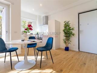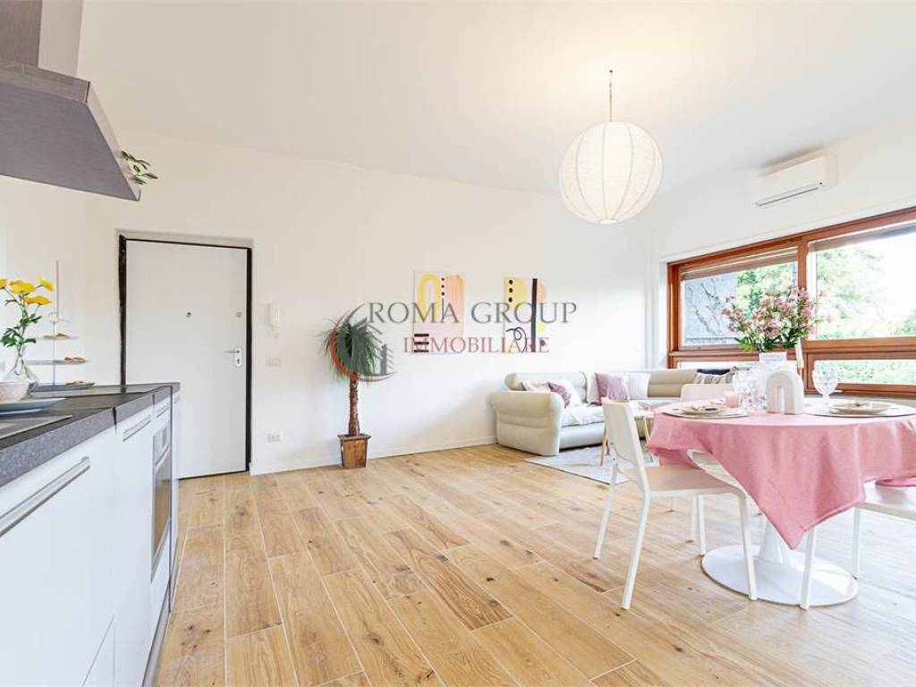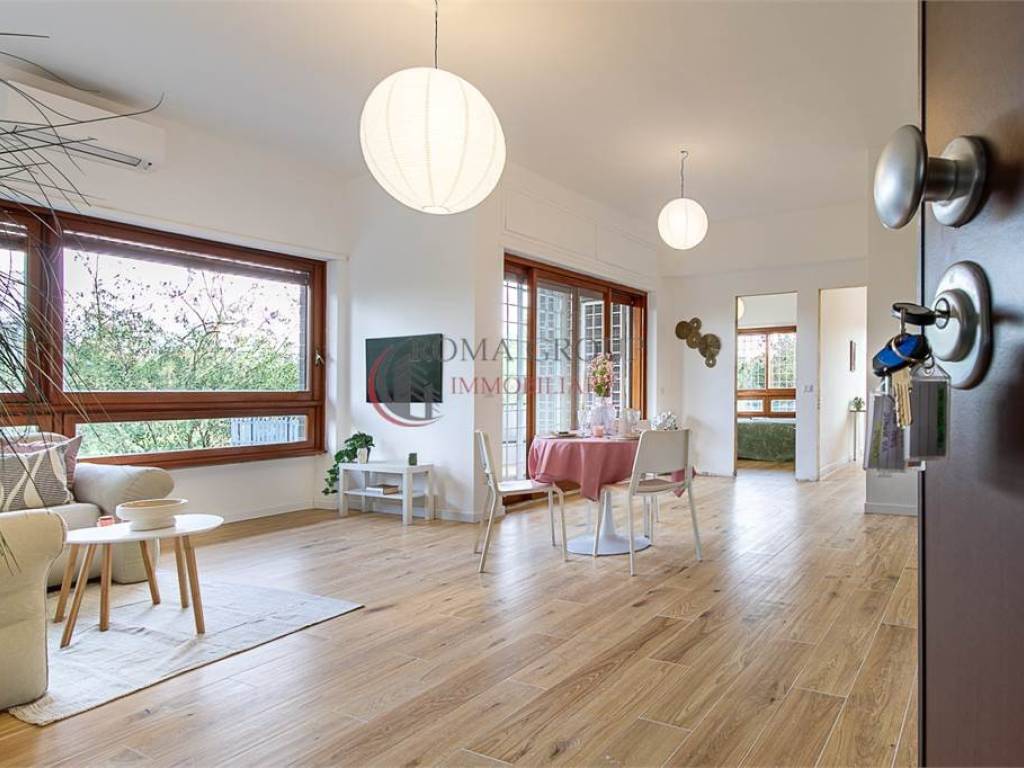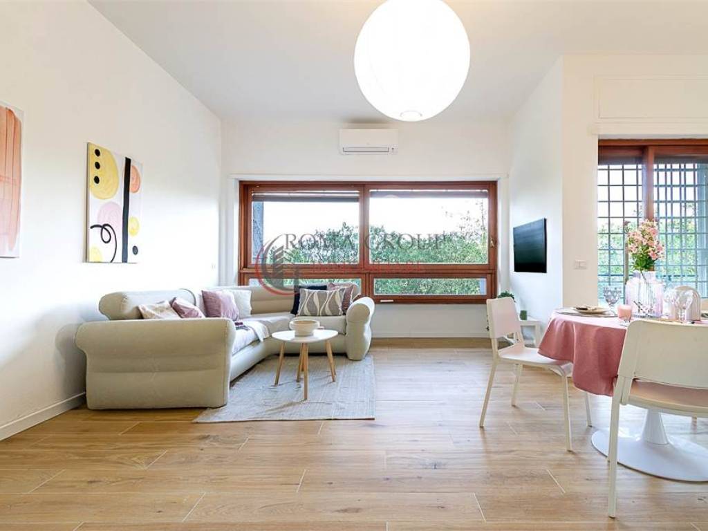 Roma Group propone in vendita trilocale totalmente ristrutturato di 85 mq interni con terrazzo di 15 mq, posto auto e cantina, situato al piano terra con affaccio da primo all' interno di una palazzina signorile immerso nel verde.