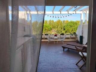 La soluzione presenta pavimentazione in parquet, infissi in pvc con doppi vetri, zanzariere, riscaldamento centralizzato e condizionamento autonomo.