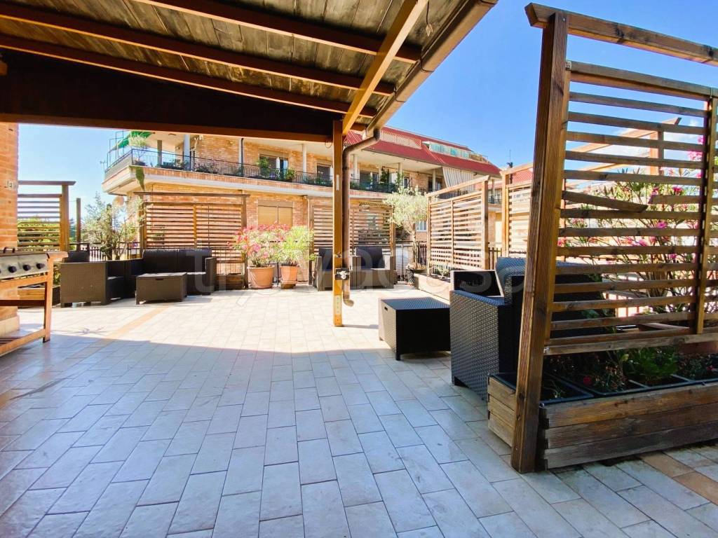 Internamente l'attico si compone di: ampio ingresso, cucina separata abitabile ed arredata, soggiorno, due ampie camere da letto, 2 bagni con finestra, balcone e grande terrazzo, molto profondo, con pergola in legno, lavatoio e barbecue.