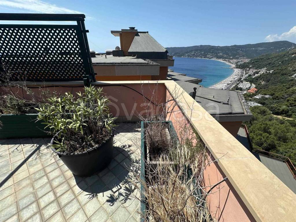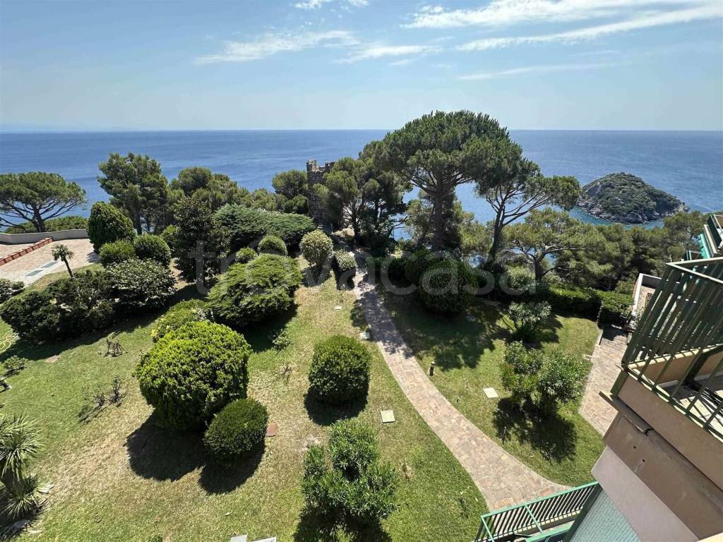 Nostra esclusiva - Fantastico attico totale vista mare, Isola di Bergeggi e Torre Saracena con box auto. Composto da ingresso, fantastico salone con doppia uscita su ampia terrazza totale vista mare, Isola di Bergeggi e Torre Saracena, cucinotto con uscita su terrazza vista mare, 3 camere da letto tutte con uscita su terrazza vista mare, 1 bagno finestrato completo di doccia, 1 bagno non finestrato completo di doccia e ripostiglio. Fantastica terrazza che gira tutto intorno all'immobile con vista a 360 gradi. Ampio garage con serranda elettrica, apertura di 2,70 ed altezza a 3,5 Mt, con adiacente ascensore per salire direttamente all'immobile. Immobile in perfette condizioni ed utilizzabile da subito, arredo compreso. Finestre in legno con doppio vetro e tapparelle elettriche. Ove presente, persiane in alluminio. Riscaldamento autonomo a metano ed impianto di condizionamento daikin. Immobile con spazi esterni eccezionali e con una vista mare davvero unica, con affaccio sull'Isola di Bergeggi e sulla Torre Saracena: pezzo davvero rarissimo!