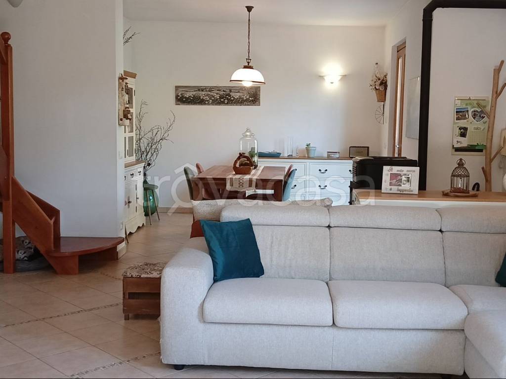 La casa è disposta su due livelli e circondata da un ampio terreno disposto su 3 fasce distinte tutte completamente recintate; al piano interrato si trova un magazzino-garage di ben 100 mq completamente in cemento armato utilizzabile per molteplici funzioni. Al piano terra della casa troviamo un ampio open space con soggiorno e cucina a vista, ripostiglio, camera da letto matrimoniale e bagno con vasca e doccia; al piano superiore troviamo una seconda camera da letto, un sottotetto utilizzato come ripostiglio, un piccolo bagno di servizio e una stanza da poter adibire ad ufficio o terza camera. La camera e l'ufficio affacciano entrambi su un grosso terrazzo con vista sulla rocca di Perti.