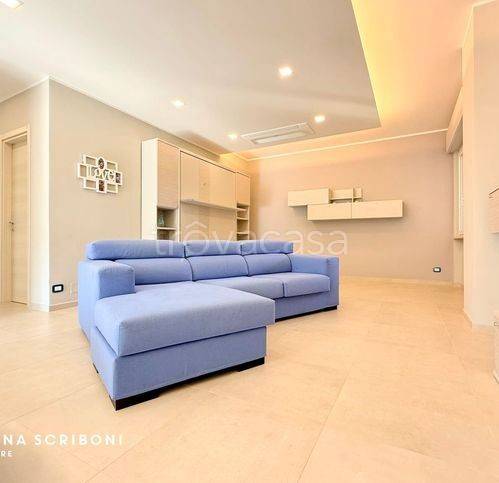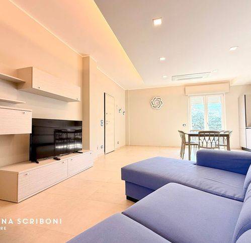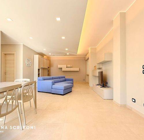 L’ingresso introduce subito in un ampio soggiorno open space, dal design contemporaneo e dai toni chiari, arricchito da faretti a soffitto a scomparsa e da una cucina integrata che dialoga in armonia con la zona living. Un ambiente di rappresentanza, pensato per essere vissuto con comfort e convivialità.