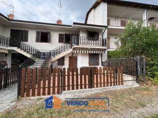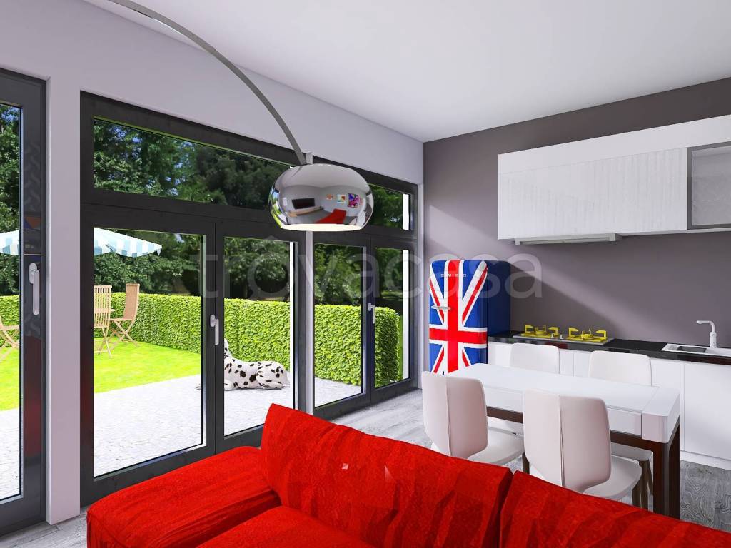 E' composta da un ingresso indipendente da giardino privato, zona living con cucina a vista, disimpegno, camera matrimoniale con accesso al secondo giardino privato con patio, bagno, cantina al piano interrato e posto auto coperto