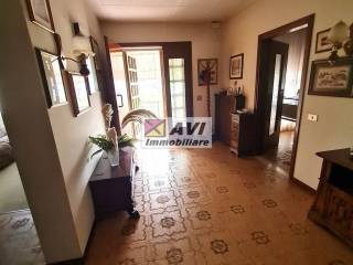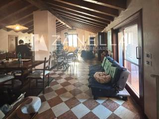 Ingresso, cucina separata con caminetto, ripostiglio, salotto con veranda in legno che ricorda molto un'altana veneziana, camera matrimoniale con bagno, cameretta con studiolo/guardaroba annesso, ulteriore camera matrimoniale e secondo bagno.