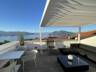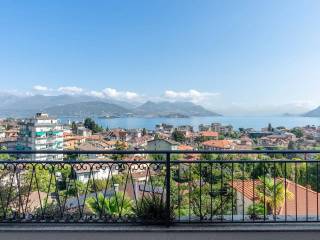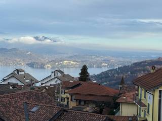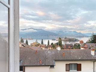 La casa in vendita distribuita su due livelli con un lungo balcone ed una vista incantevole del lago Maggiore e le sue montagne.