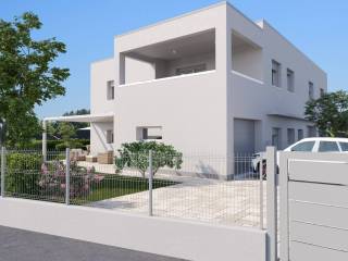 Al piano terra si trovano l’ingresso su una luminosa zona giorno, un bagno di servizio e il garage collegato direttamente all’abitazione. Il primo piano ospita tre camere da letto e un secondo bagno.