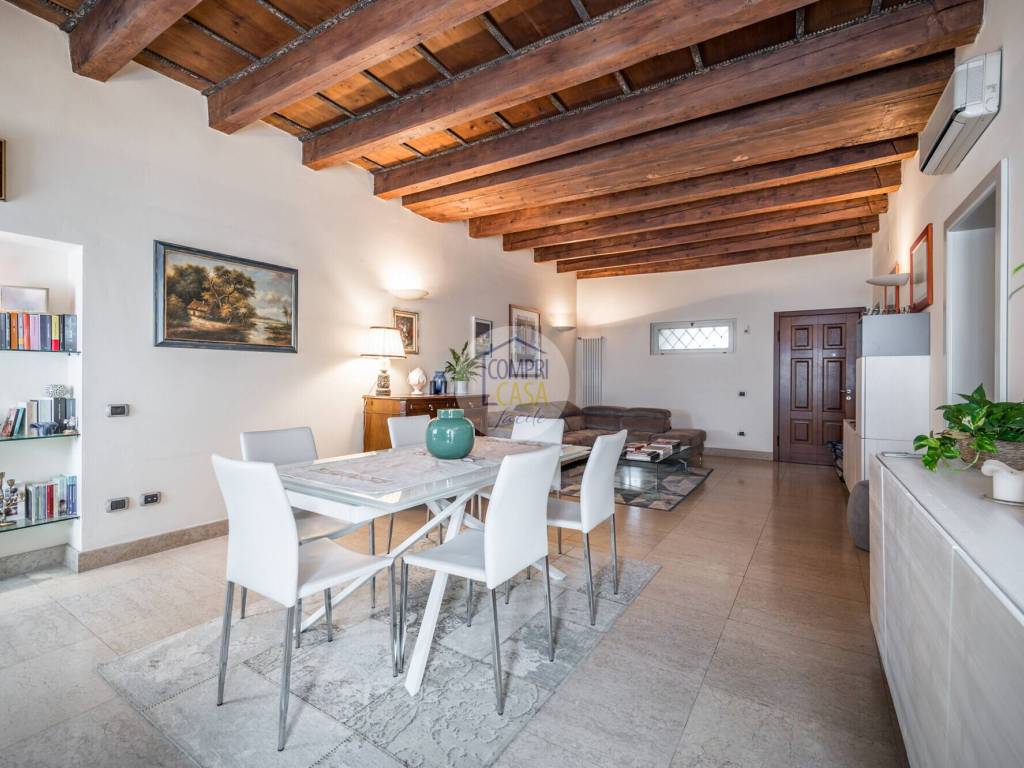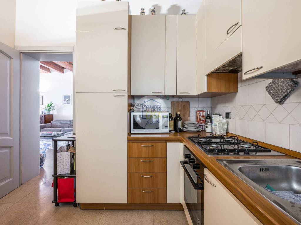 L’ingresso conduce a una zona giorno ampia e luminosa, con soggiorno e area pranzo in un ambiente lungo e arioso, valorizzato dalle travi originali. La cucina è separata e completa, pratica e ben organizzata.