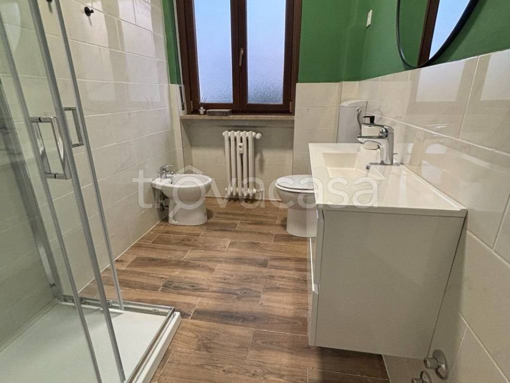 -Bagno completo: Ristrutturato con piastrelle chiare, doccia con box in vetro, bidet, wc, lavabo con mobile sottostante e finitura in verde coordinata con l'appartamento.