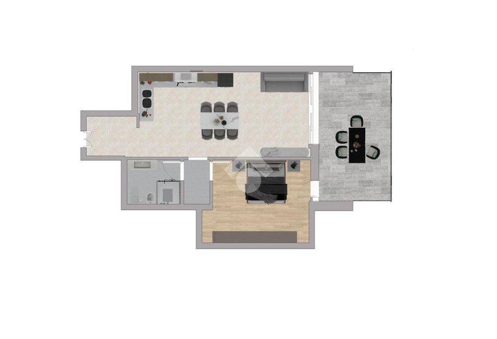 L’appartamento si presenta accogliente e ben organizzato: l’ingresso si apre su un soggiorno con angolo cottura che affaccia su un ampio terrazzo di 16 mq, ideale per godersi momenti di relax all’aperto.