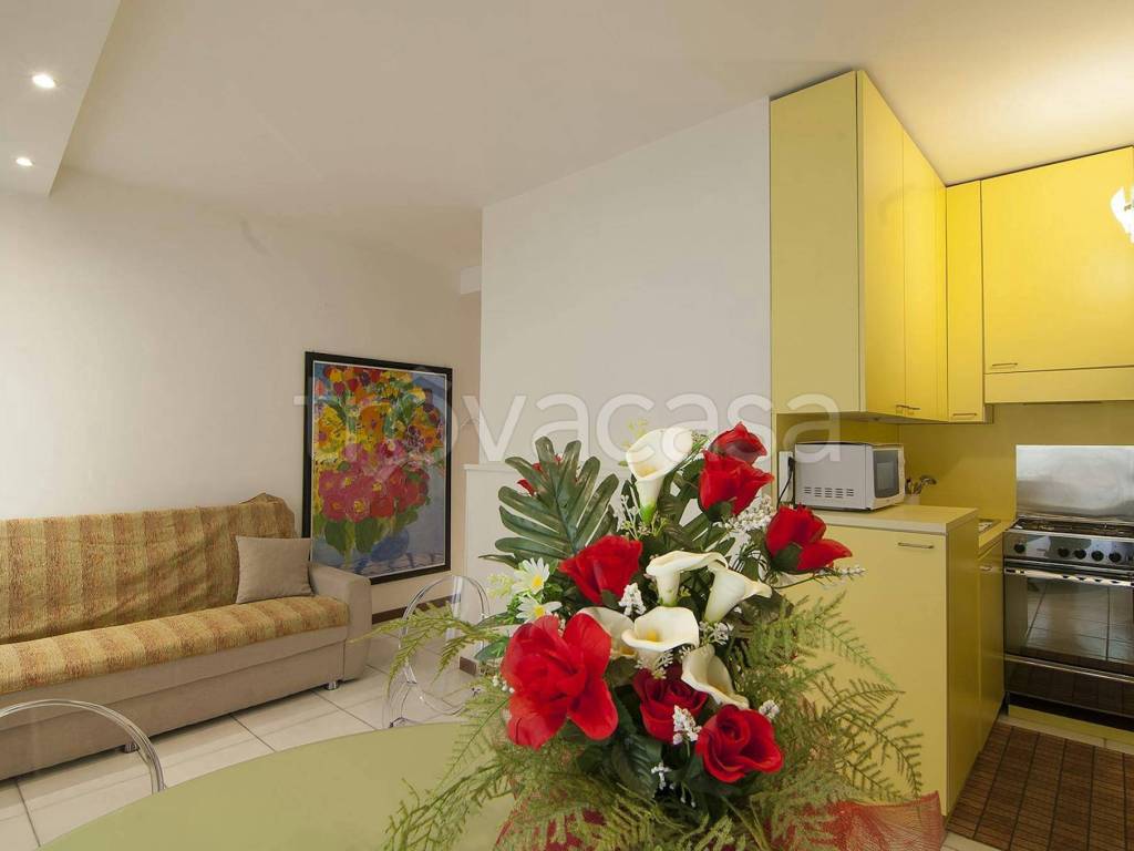 The apartment consists of a large living area with the kitchen with a 3 seaterwhite table in a modern style and a big white sofa. The bathroom has a shower. The apartment is located on the second floor of a building with elevator. The apartment is equipped with air conditioning, heating, refrigerator, microwave oven, washing machine and everything you need for your maximum comfort.\nTraduci la descrizione dell'annuncio in italiano
