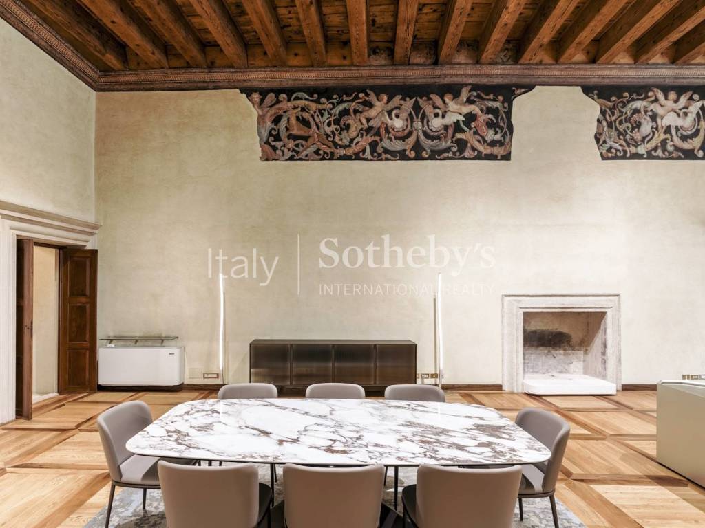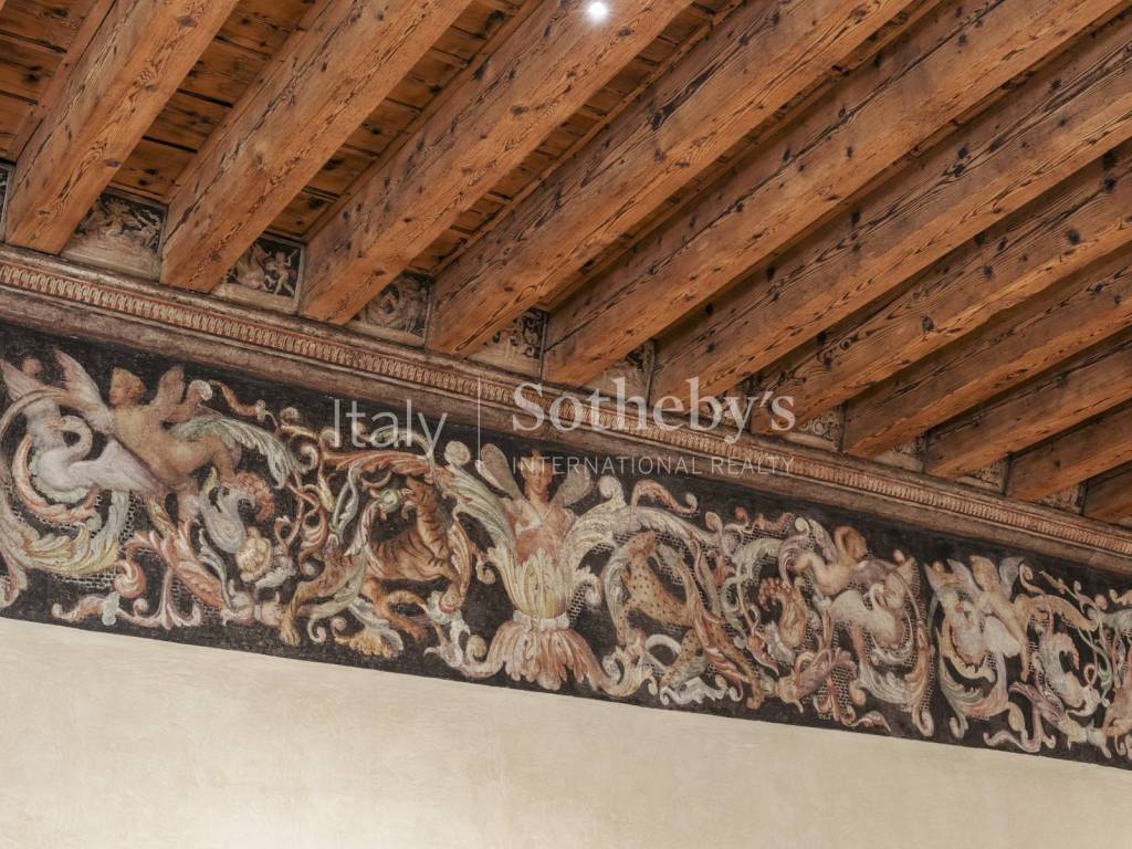 L'ingresso indipendente introduce in un maestoso salone di rappresentanza di oltre 180 mq, impreziosito da soffitti originali con travi lignee a vista, parquet in legno massello a disegno geometrico e fregi decorativi cinquecenteschi, sapientemente restaurati.