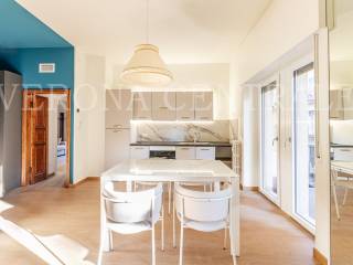Proponiamo in locazione un esclusivo e ampio quadrilocale di nuova ristrutturazione, situato al Piano Primo di un palazzo storico completamente restaurato in Via Scrimiari, una delle vie più ambite del centro di Verona.