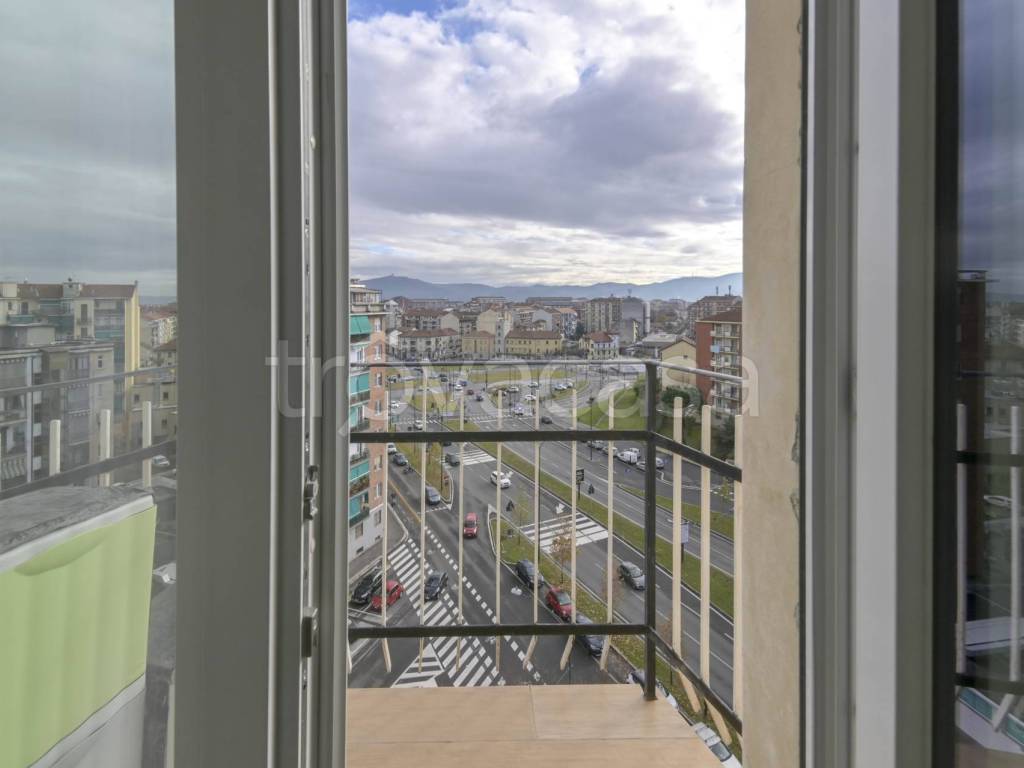 In via Borgaro, nelle vicinanze di piazza Villari, all'interno di un condominio con giardino condominiale, molto curato nelle parti comuni, alloggio al quinto piano con ascensore, vista Superga e montagne. L'ingresso con porta blindata ci conduce...