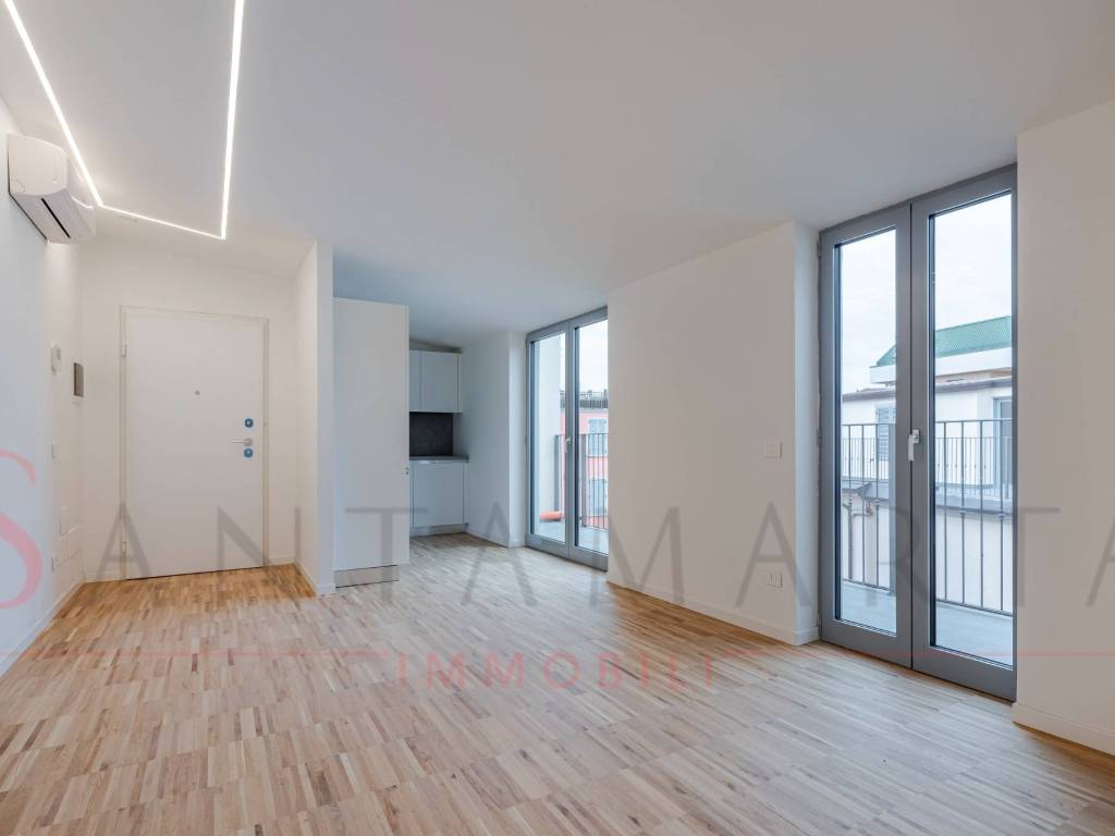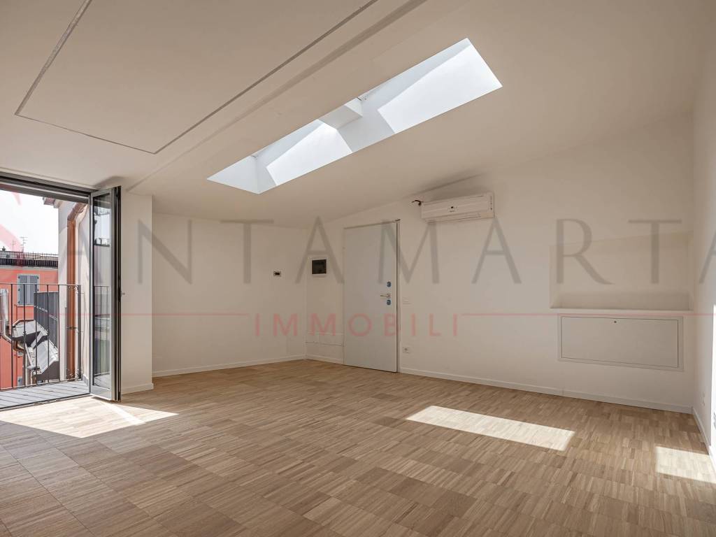 Nello storico quartiere di Forze Armate all'interno di uno storico stabile completamente rinnovato, proponiamo esclusiva mansarda ristrutturata di 56 mq oltre a 15 mq di terrazzo al quinto piano, composti da ingresso su un unico locale open space,...