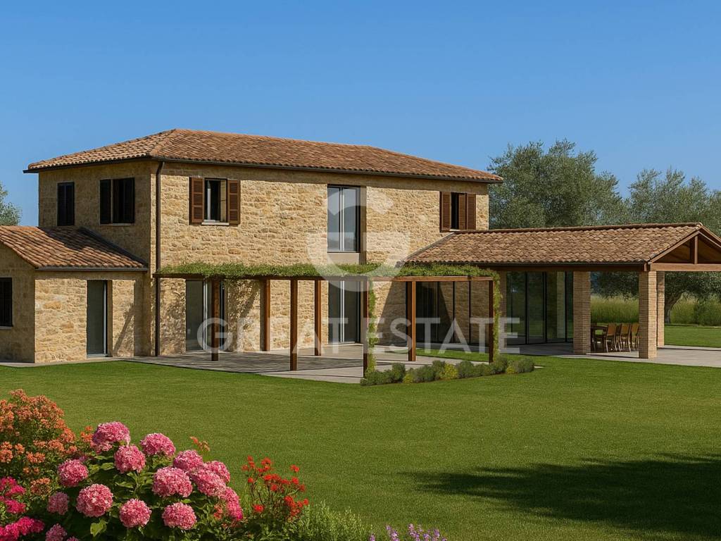Al piano terra, dall’ampio portico, si accede alla zona giorno composta da soggiorno con camino, la cucina abitabile, lo studio, il di...