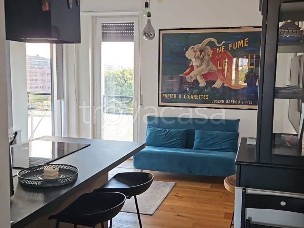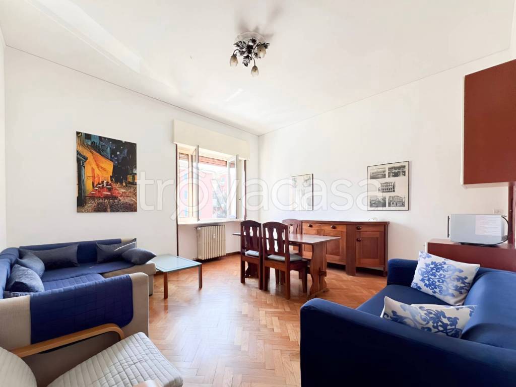 Luminoso appartamento ristrutturato e arredato al 4° piano con tripla esposizione, composto da soggiorno con cucina a vista e balcone, camera matrimoniale con secondo balcone, camera singola e ampio bagno. Dotato di aria condizionata (due split),...