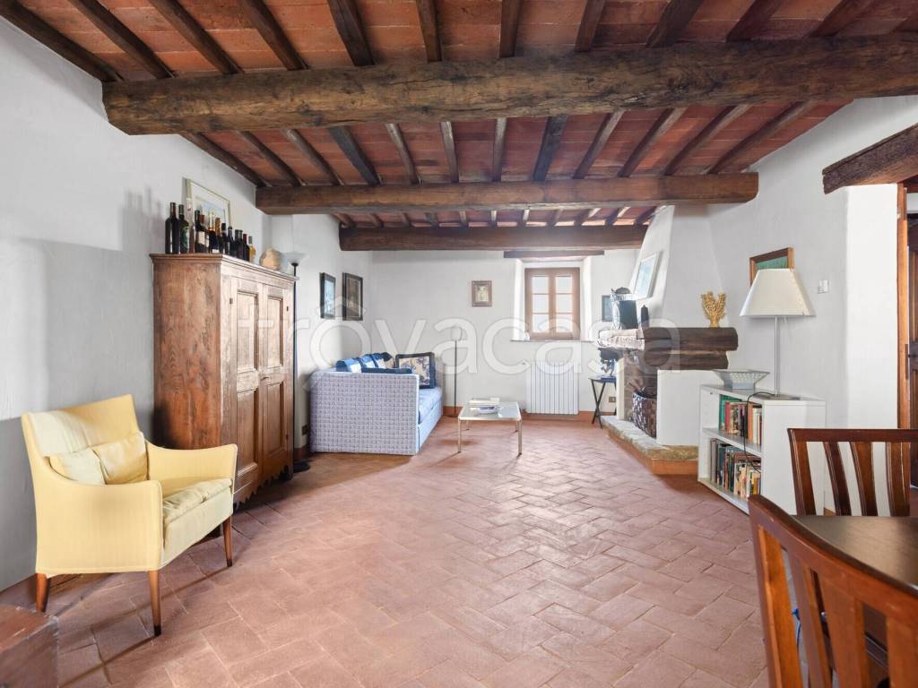 Appartamento su due piani, in antico casale in pietra ristrutturato con giardino e piscina a comune, in magnifica posizione dominante perfettamente collegata a Siena, Firenze ed Arezzo. Appartamento "belvedere", mq. 129: P1: sala con ang. Cott. ,...