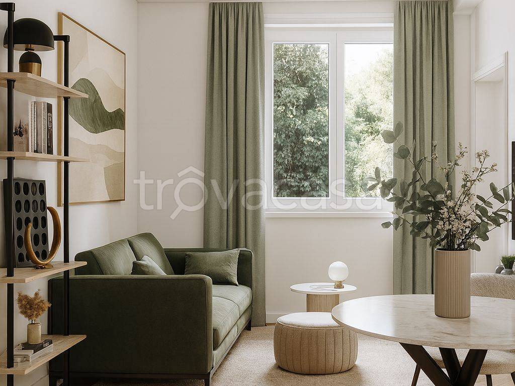 La zona giorno si apre su un ampio soggiorno con balcone, una luminosa...