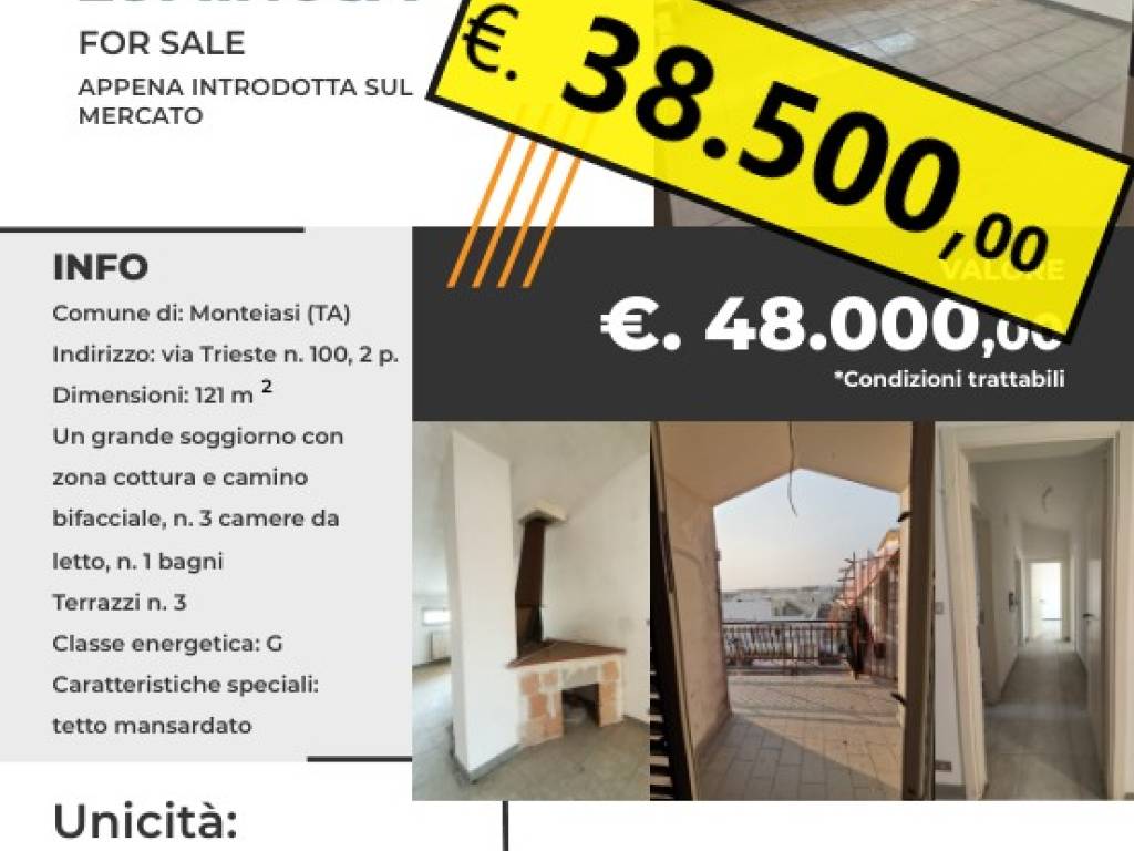 A Monteiasi (Ta), paese distante circa 7,6 km da Grottaglie e 23 km da Taranto, proponiamo in vendita appartamento indipendente al piano terra cosi composto: ingresso in ampio corridoio e disimpegno, 3 ampie camere da letto, studio, salone, sala...
