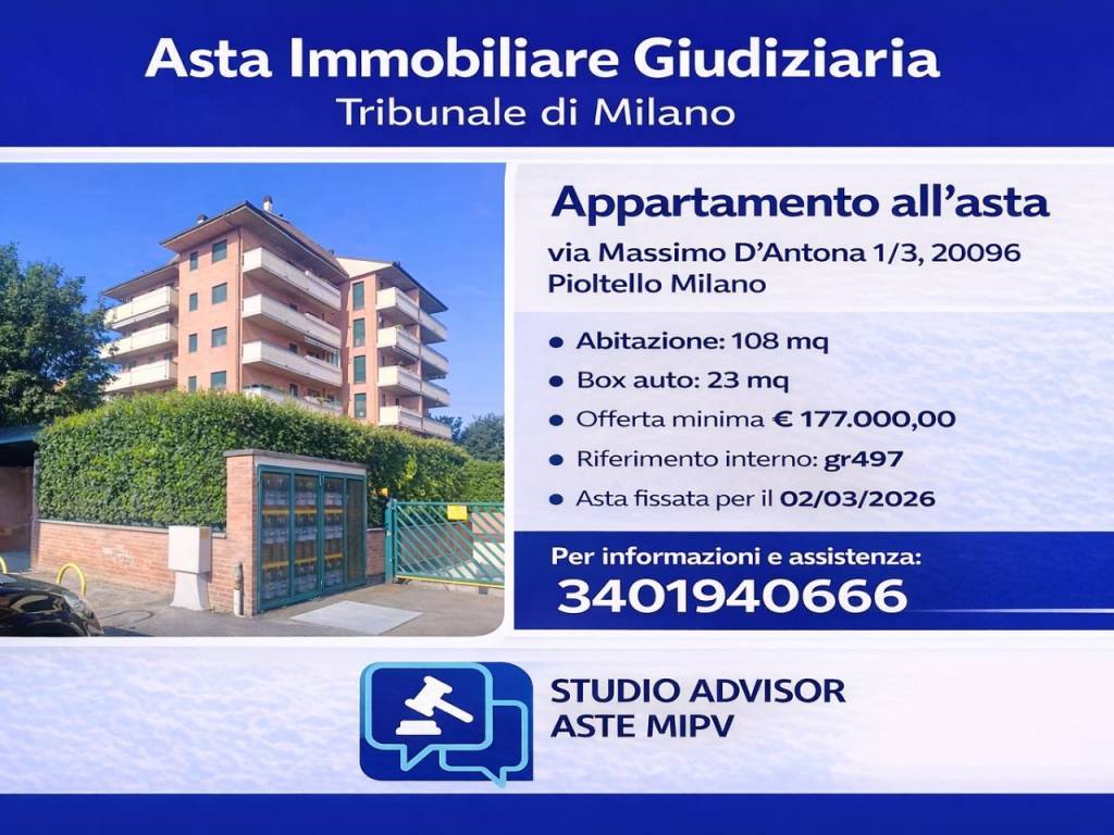 In Comune di Pioltello (mi), Piazza dei Popoli n. 7, la piena proprietà di:- appartamento ad uso abitazione al terzo piano della superficie commerciale di 110 mq. Composto da corridoio d’ingresso, soggiorno, cucina, due disimpegni, due...