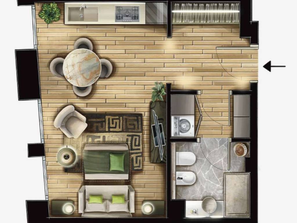 Soluzione situata al piano terra in un complesso di nuova costruzione con ingresso indipendente e corte privata.