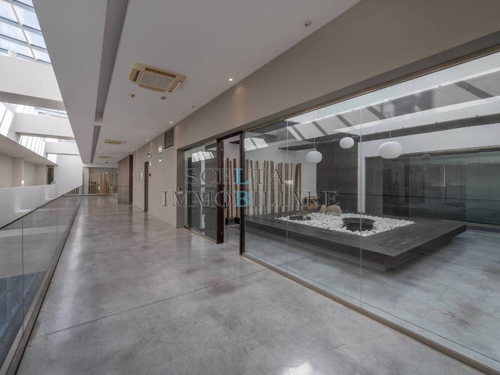 Ufficio di 85 mq, molto luminoso grazie alle grandi pareti vetrate, composto da 2 ampie stanze, di cui una con possibilità di ulteriore divisione, portando il totale degli ambienti a 3; 2 bagni.