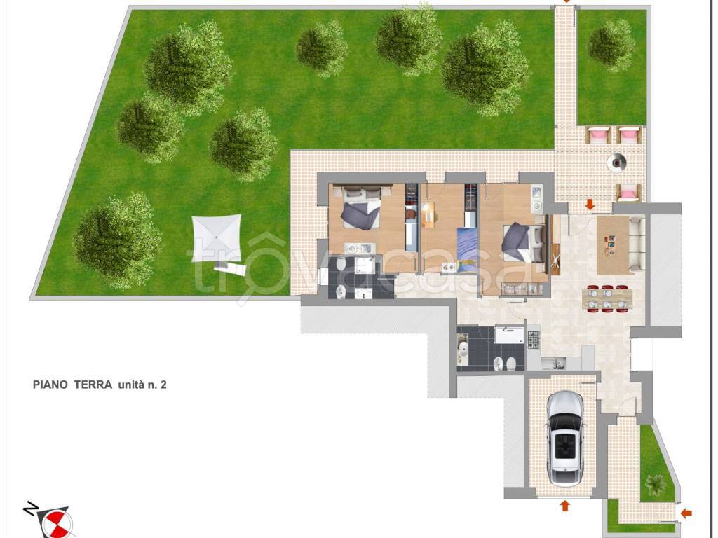 Posto al piano terra lato nord est ha ingresso sul lato ovest con accesso diretto al garage ed al soggiorno cucina, per poi, tramite un disbrigo, passare alla zona notte con lavanderia, un bagno, due camere doppie e la singola posta al centro. Anc...